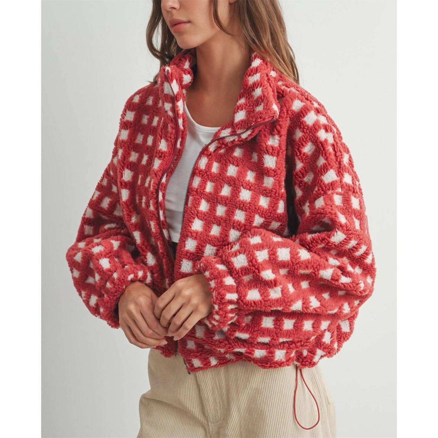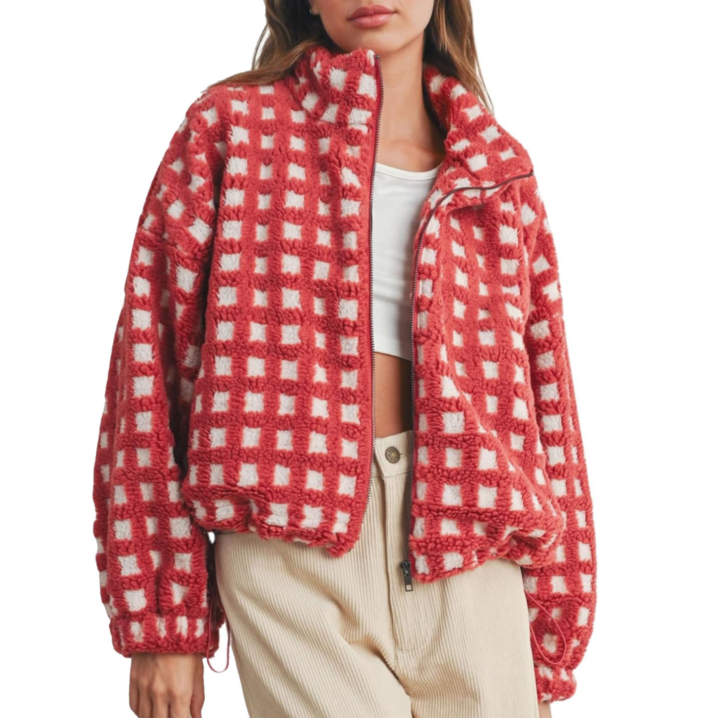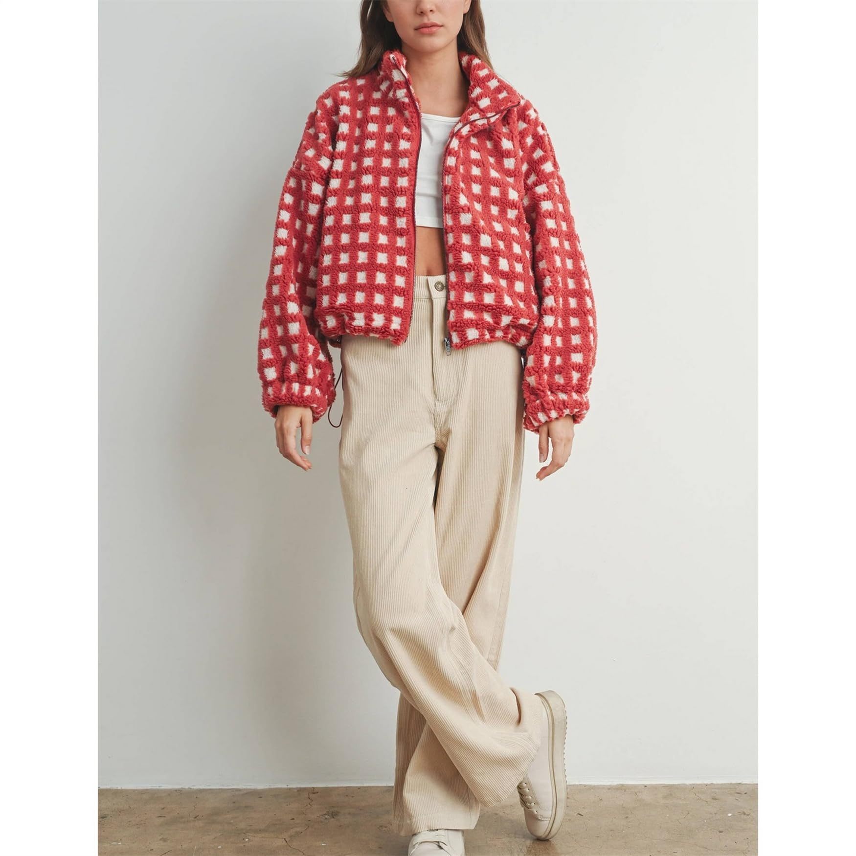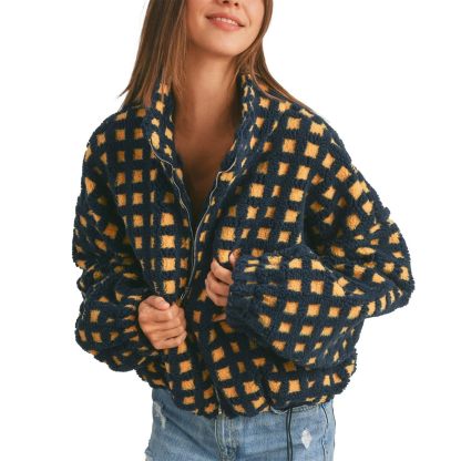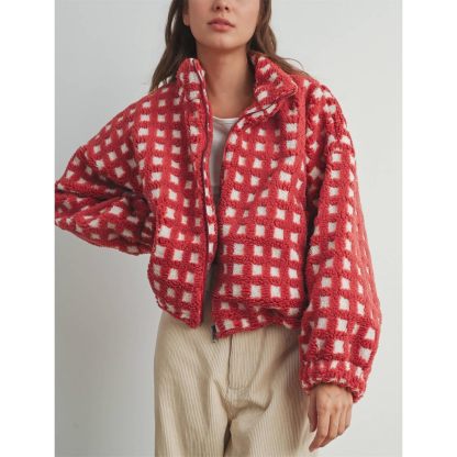 This stand-up collared checked jacket features vibrant colors, is incredibly soft against your skin, and zips shut. Perfect for casual everyday wear, it's the perfect addition to your wardrobe.