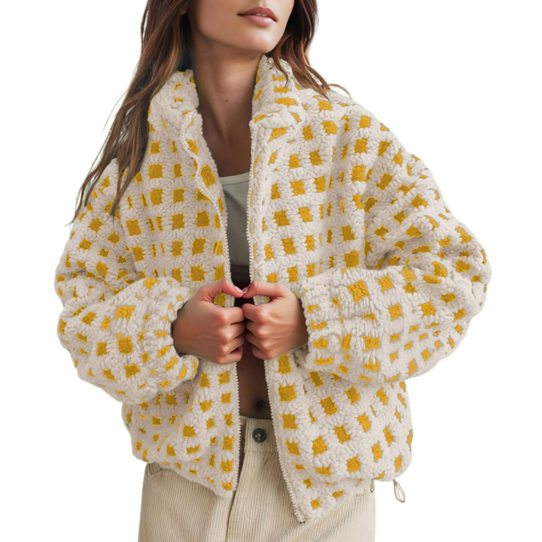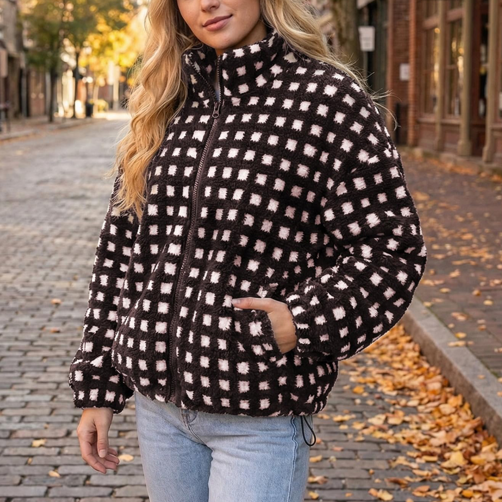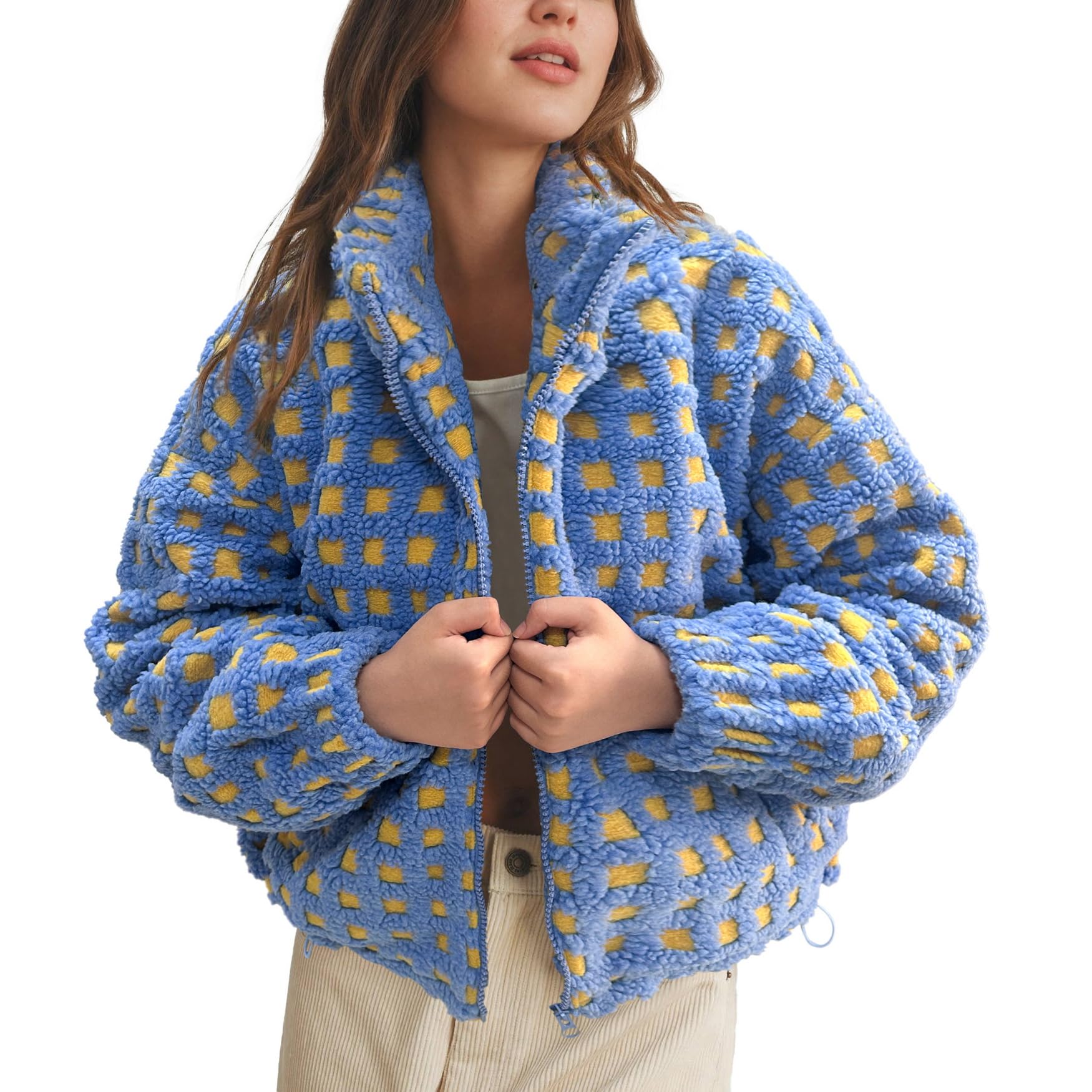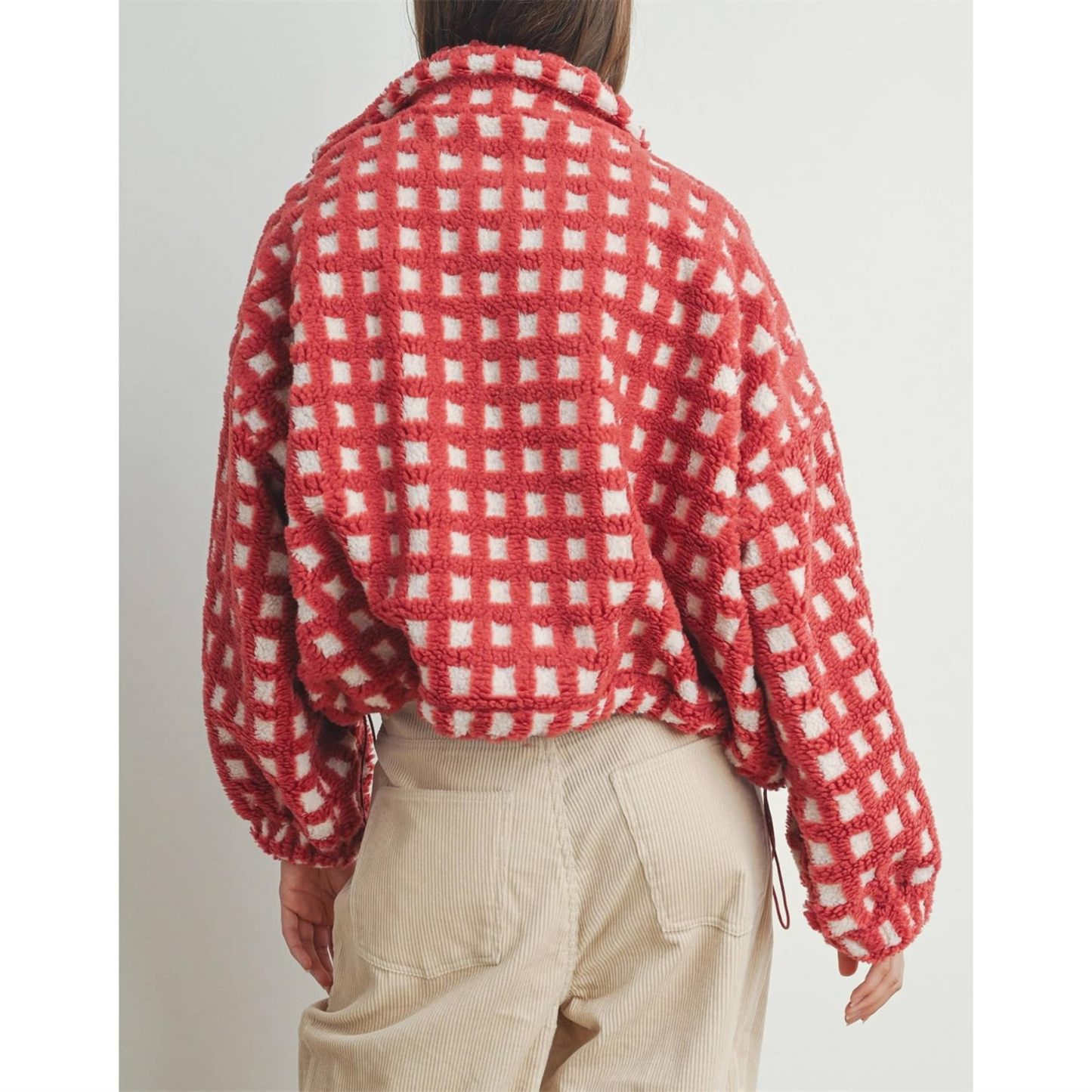 This stand-up collared checked jacket features vibrant colors, is incredibly soft against your skin, and zips shut. Perfect for casual everyday wear, it's the perfect addition to your wardrobe.