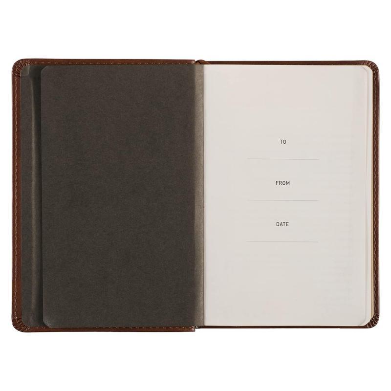 The devotional book's compact size makes it easy to slip into a backpack for devotions on the go, and a presentation page lets you personalize it. A brown satin ribbon marker is included to keep your place. The two-color pages are gilt-edged and match the gold foil accents in the cover perfectly.
