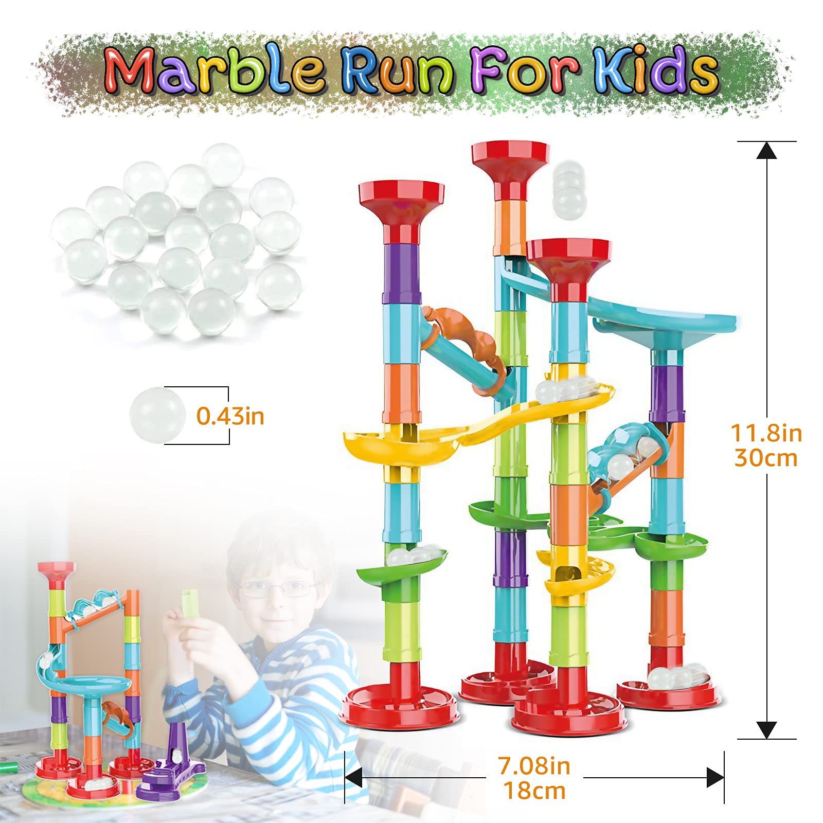 GREAT STEM TOY: This marble run set comes with an assembly instruction to help kids’ hand-eye coordination (assem as colors instruct). After they learned, they will have ability to build any different tracks by their imagination and logical mind, endless fun for your child to watch marbles run along tracks.If for toddlers,please take care of them because marble run set includes marbles smaller than regular.