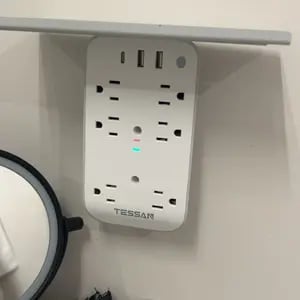 "I bought this for my dorm room, and it’s a lifesaver! I can charge all my devices in one spot, and the shelf is perfect for holding my glasses and small essentials. It fits perfectly behind my desk, so it doesn’t take up any space!"